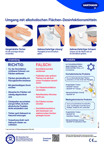 - Wirksamkeit: Setzen Sie ein Flächendesinfektionsmittel ein, dessen Wirkstoff auf das Gefahrenpotenzial abgestimmt ist (bakterizid/viruzid).