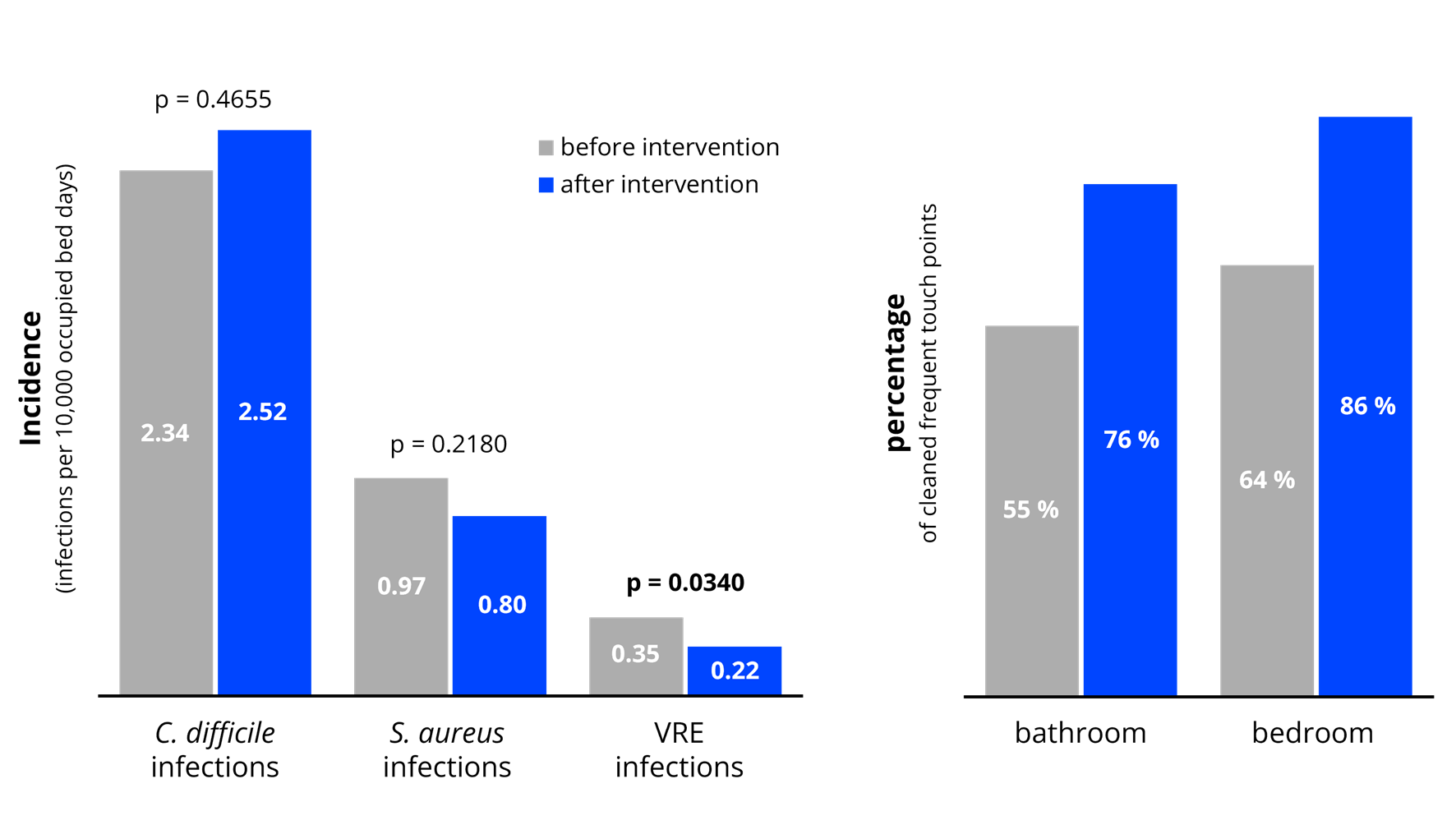 Die Wirksamkeit dieser Maßnahmen wurde durch Bestimmung der Inzidenzen von Staphylococcusaureus-Bakteriämie (Methicillin-resistent sowie -sensitiv), Clostridioidesdifficile-Infektionen und Infektionen mit Vancomycin-resistenten Enterokokken (VRE) bewertet. Zusätzlich wurde durch Verwendung eines fluoreszierenden Markers die Gründlichkeit der Reinigung auf High-Touch-Oberflächen gemessen.