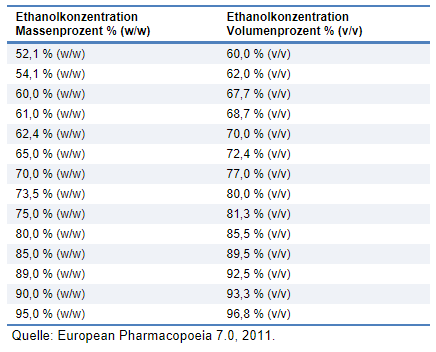 In der folgenden Tabelle sind verschiedene Ethanol-Konzentrationen in Volumen- und Massenprozent gegenübergestellt: