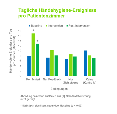Im Verlauf der Studie wurden insgesamt 1.894 HHE elektronisch registriert, davon 422 in der Gewöhnungsphase, 427 in der Baseline-Phase, 576 während der Intervention und 469 nach dieser (Post-Intervention). Dabei zeigte sich, dass nur die Kombination aus Feedback + Zielsetzung die mittlere Anzahl täglicher HHE pro Patientenzimmer im Vergleich zu Baseline signifikant erhöhte – und zwar sowohl während der Intervention als auch danach. Die beiden Stationen, die entweder nur Feedback oder nur Zielsetzung anwandten, erreichten im Gegensatz dazu keinen statistisch signifikanten Anstieg.