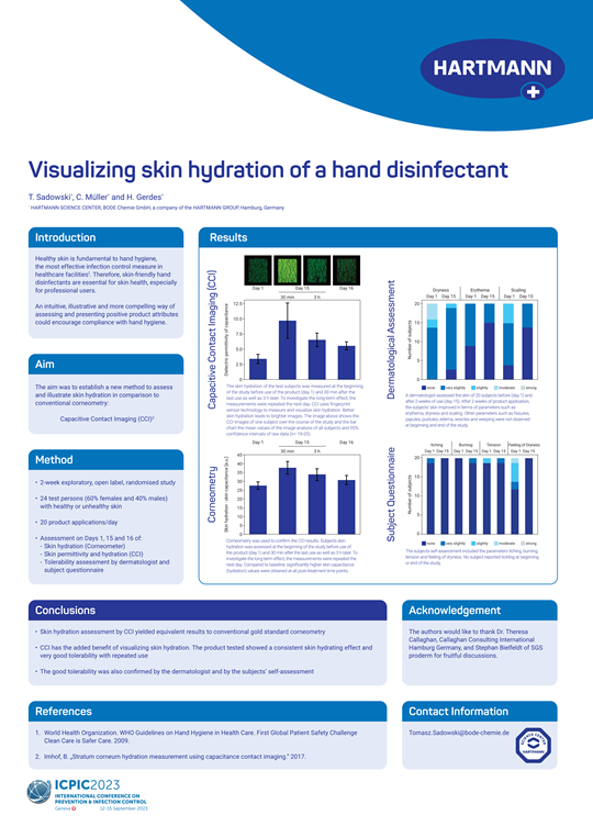 Die regelmäßige tägliche Anwendung des Produktes führte zu einer Verbesserung der Hautfeuchtigkeit, ohne dass Unverträglichkeiten auftraten. Die mittels CCI und Corneometrie erzielten Ergebnisse waren durchweg vergleichbar und zeigten eine signifikant erhöhte Hautfeuchtigkeit nach dem zweiwöchigen Anwendungszeitraum. CCI visualisierte die erhöhte Hautfeuchtigkeit und zeigt damit das Potenzial für den Einsatz als Methode zur Bewertung und zum Nachweis der Auswirkungen von Hände-Hygieneprodukten auf die Hautgesundheit [1].