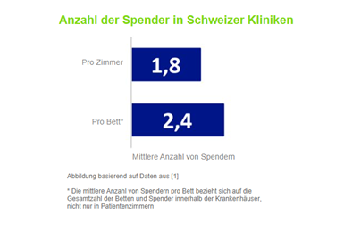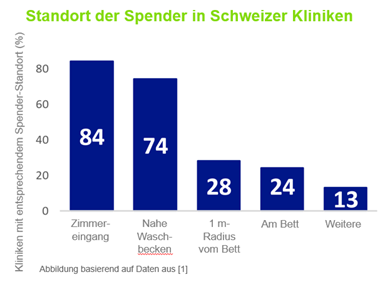 Bei der Erhebung der gesamten Spenderzahlen in den jeweiligen Kliniken zeigte sich, dass Schweizer Krankenhäuser mit durchschnittlich 2,4 HDM-Spendern pro Patientenbett sehr gut ausgerüstet sind. Diese Zahl liegt somit – bezogen auf Intensiv- bzw. Normalstationen – 2- bis 4-mal höher als die vom RKI für deutsche Kliniken empfohlene Anzahl. Außerdem ergab die Studie, dass in großen Krankenhäusern mit mehr als 500 Betten die Anzahl der HDM-Spender mit dem HDM-Verbrauch korrelierte. Das könnte ein Hinweis darauf sein, dass die Händehygiene umso besser eingehalten wird, je mehr Spender verfügbar sind.