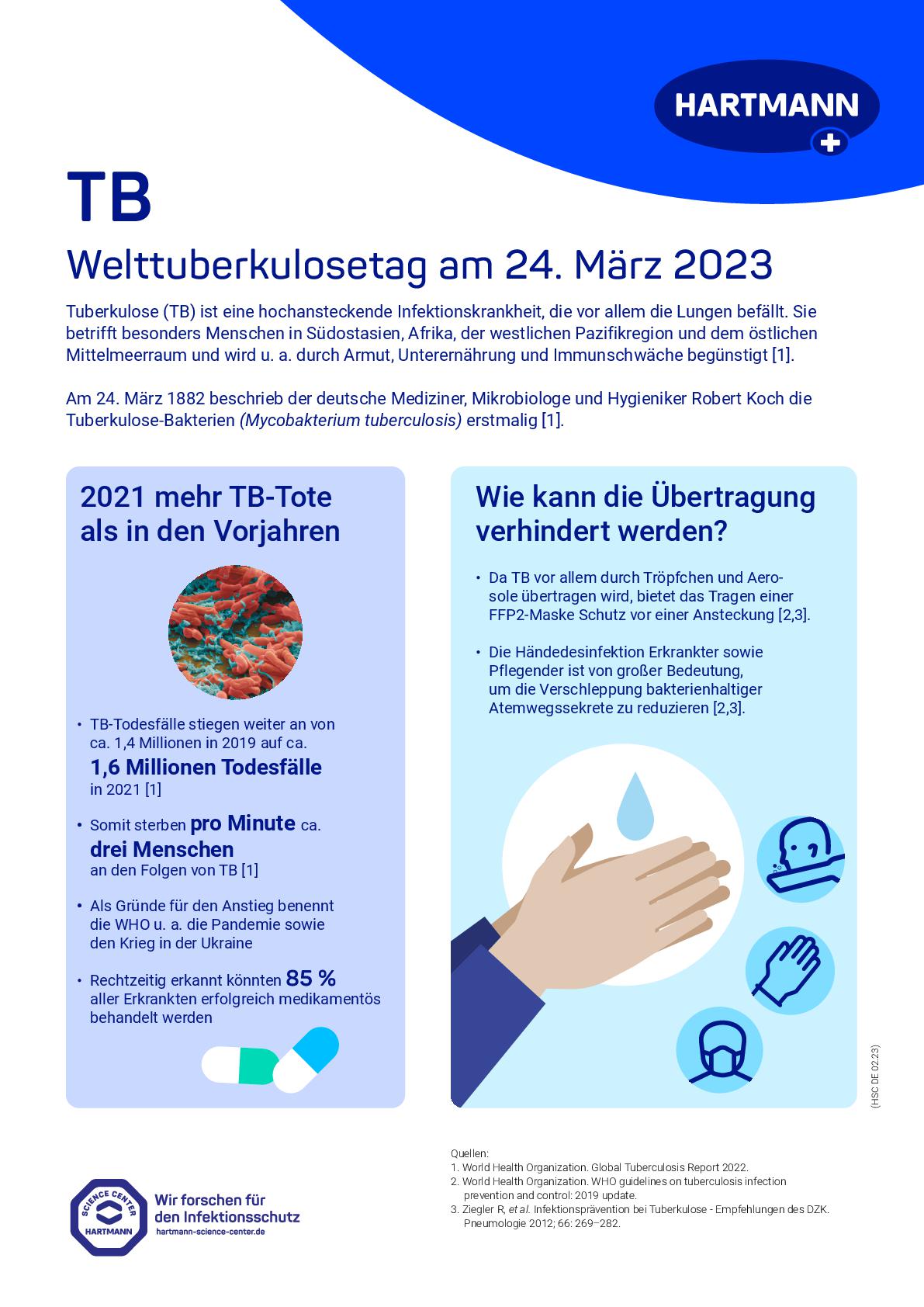 Wir finden: Grund genug, mit dem Aktionstag die Krankheit und deren Bekämpfung sowie Vermeidung wieder verstärkt in den Fokus zu rücken. Da TB vor allem durch Tröpfchen und Aerosole übertragen wird, ist eine gute Hustenetikette – also das Husten in Hand oder Ellbogen mit anschließender Händehygiene – von großer Bedeutung, um die Verschleppung bakterienhaltiger Atemwegssekrete zu reduzieren. Tragen auch Sie durch die richtige Händehygiene dazu bei, Infektionsketten zu durchbrechen und teilen Sie Ihr Engagement gegen TB unter den Hashtags #WorldTuberculosisDay, #MissionInfectionPrevention und #HandHygiene! Auf der Seite des Aktionstags finden Sie außerdem Kampagnenmaterialien wie Infografiken und Webbanner, die Sie für Ihre Aktionen verwenden können.