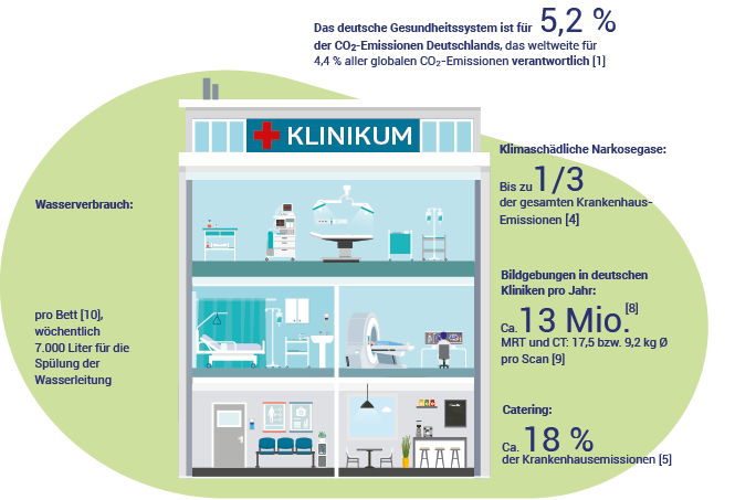 Um dem Klimawandel entgegenzuwirken, muss auch im Gesundheitssystem drastisch umgedacht werden. Da zunehmend Menschen in Folge des Klimawandels – z.B. durch extreme Hitze oder schlechte Luft- und Wasserqualität – erkranken werden, müssen nicht nur die eigenen Emissionen reduziert, sondern auch Anstrengungen zur Primärprävention vorangetrieben werden. Das Thema „Nachhaltiges Krankenhaus“ gewinnt glücklicherweise immer mehr an Aufmerksamkeit, doch der Weg dahin ist noch weit und erfordert das Engagement aller Beteiligten.