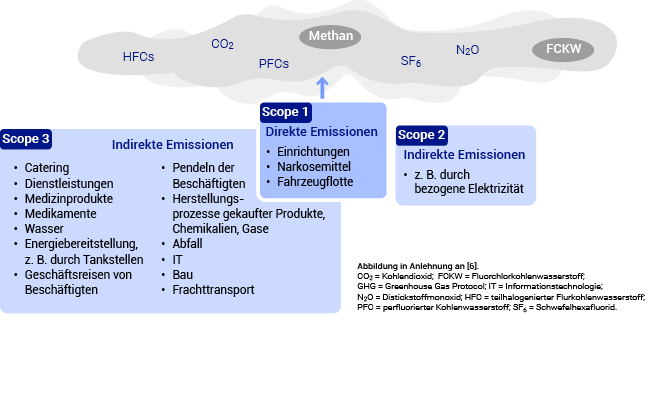 Um die eigene Treibhausgasbilanz zu ermitteln, diese berichten zu können und eine Nachhaltigkeitsstrategie zu erarbeiten, müssen zunächst die verschiedenen Bereiche kategorisiert werden, in denen Treibhausgase direkt oder indirekt entstehen. Als Standard hierfür gilt das sogenannte „Greenhouse Gas (GHG)-Protokoll“, das die Emissionen in drei Scopes einteilt [5]. Während Scope 1 nur direkte Emissionen aus der eigenen Verbrennung – z.B. durch Benzin für die Rettungswagen – beinhaltet, fallen unter Scope 2 indirekte Emissionen aus dem Bezug von leitungsgebundener Energie für Heizung oder Elektrizität. Scope 3 beinhaltet sonstige indirekte Emissionen aus Prozessen, die z.B. durch eingekaufte Medizinprodukte und Verbrauchsmaterialien verursacht werden. Auch wenn Scope 3 üblicherweise den größten Anteil des CO2-Fußabdrucks ausmacht – im Gesundheitswesen ca. 60 % der Gesamtemissionen [6] –, sind diese Emissionen auch am schwierigsten zu erheben und müssen teilweise geschätzt werden. Während das GHG-Protokoll den Bericht über Emissionen aus Scope 3 wegen der Überlappung mit anderen Unternehmen als optional betrachtet, sollen die für das jeweilige Unternehmen bedeutsamsten Scope-3-Emissionen jedoch gemäß CSRD aufgeführt werden [4, 5].