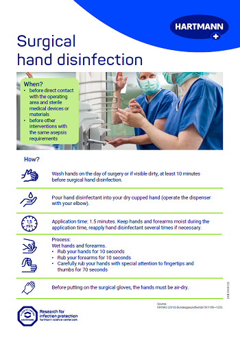 Different studies have shown that surgical gloves are not an absolutely safe barrier against pathogens. Prior to surgeries, medical staff completely wet hands and forearms with a hand disinfectant to reduce the transmission of microorganisms to surgical wounds to the greatest possible extent - even when glove perforation occurs.