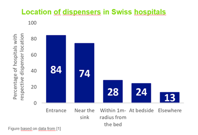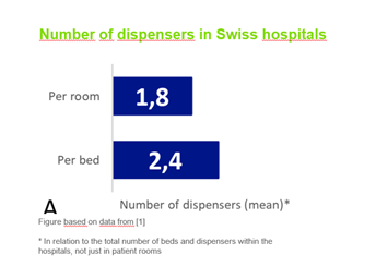 It is generally accepted that hand hygiene with alcohol-based hand disinfectants is the most effective measure for preventing healthcare-associated infections [1]. It is obvious that adequate hand hygiene for employees in health care facilities is only practicable if sufficient hand disinfectant dispensers are available at suitable locations. So far, however, only the German Robert Koch-Institute (RKI) has issued recommendations on the number of hand disinfectant dispensers and recommends at least one dispenser per bed in intensive care units or 0.5 per bed in normal wards. In contrast, neither the World Health Organisation (WHO) nor the American Centers for Disease Control and Prevention (CDC) nor the European Centre for Disease Prevention and Control (ECDC) have made such recommendations in their respective guidelines. In order to provide a basis for setting national and international minimum standards, a research group led by Professor Andreas Widmer of the SwissnosoNational Centre for Infection Prevention investigated the current number and locations of hand disinfectant dispensers in Swiss acute hospitals [1].