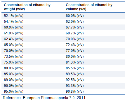 The reason for this difference is a special feature when mixing ethanol with water: the so-called volume contraction. This means that mixing 50 ml of ethanol with 50 ml of water does not produce a volume of 100 ml as expected, but less. One can imagine this phenomenon as the molecules of ethanol and water mixing together more closely than with pure ethanol or water. Cavities between bigger molecules are being filled with smaller molecules.